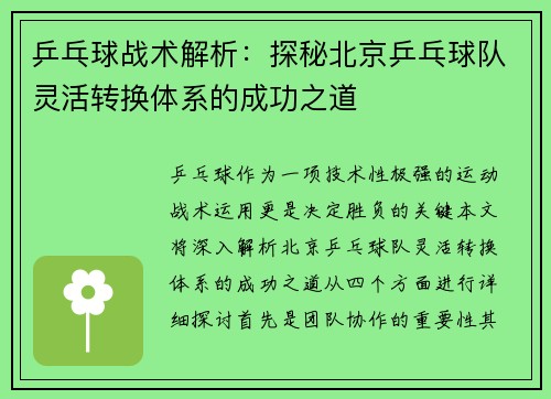 本文将深入探讨成都与北京羽毛球队在对决赛后的分析与节奏掌控。首先,文章将从两队的战术执行情况入手,分析各自的优缺点以及在比赛中所采取的不同策略。接着,将讨论比赛中双方选手的心理状态如何影响比赛节奏,进一步剖析运动员在关键时刻的表现。随后,文章将关注赛后数据分析的重要性,包括技术统计和战术行为,以便更好地理解比赛结果背后的原因。最后,将探讨教练组在调整策略和指挥比赛中的角色,强调团队协作与个人能力之...